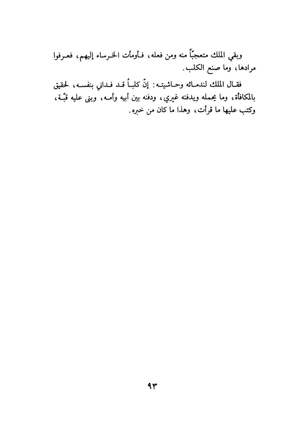 وبقي الملك متعجبا منه ومن وفعله فأومأت الخرساء فعرفوا مرادها بما صنع الكلب فقال الملك لندمائه وحاشيته أن شيئا قد فداني بنفسه لتحقيق بالمكافأة وما يحمله ويدفنه غيري ودفنه بين أبيه وأمه وبنى عليه قبة وكتب عليها ما قرأت وهذا ما كان من خبره@