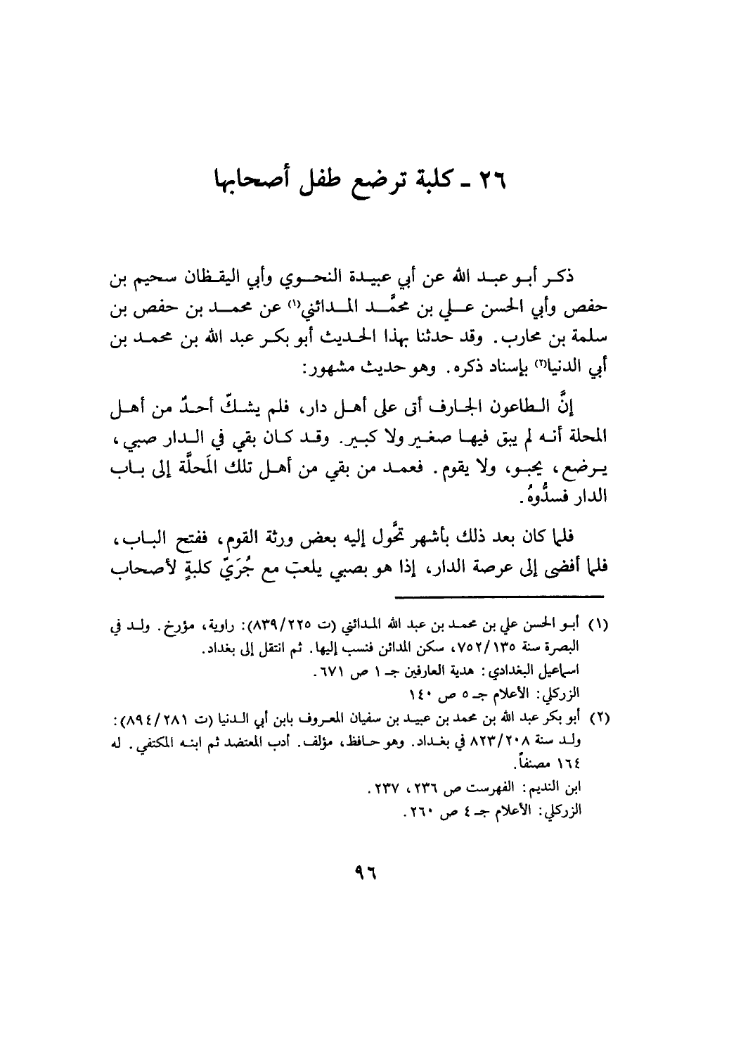 فلما كان بعد ذلك بأشهر تحول إليها بعض ورثة القوم فلما فتح الباب وأفضى إلى عرصة الدار إذا هو بصبي يلعب مع جرو كلبة كانت لأصحاب@