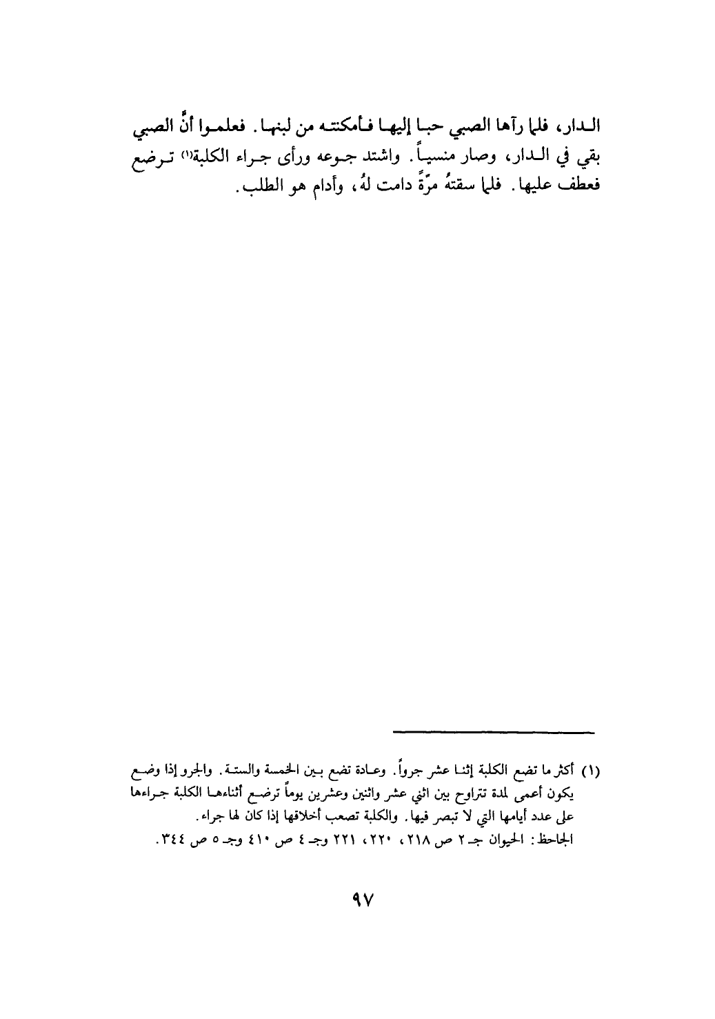 الدار فلما رآها الصبي حبا إليها فأمكنته من لبنها فعلموا أن الصبي بقي في الدار وصار منسيا واشتد جوعه ورأى جرو الكلبة يرضع فعطف عليها فلما سقته مرة أدامت له وأدام لها الطلب@