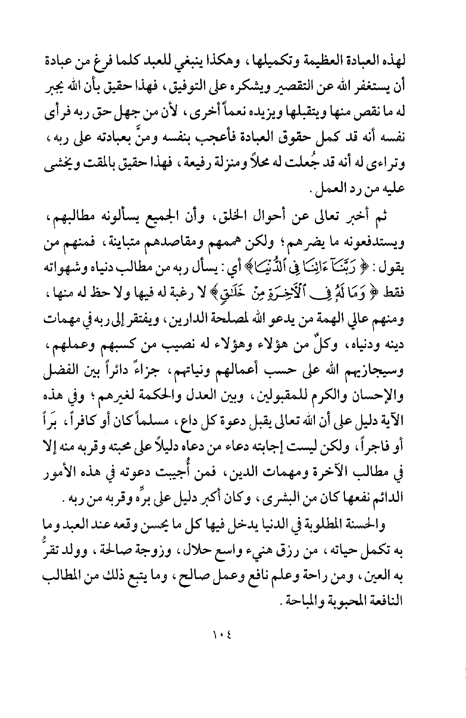 ثم أخبر تعالى عن أحوال الخلق، وأن الجميع يسألونه مطالبهم، ويستدفعونه ما يضرهم؛ ولكن هممهم ومقاصدهم متباينة، فمنهم من يقول: {رَبَّنَا آتِنَا فِي الدُّنْيَا} [البقرة: 200] أي: يسأل ربه من مطالب دنياه وشهواته فقط، {وَمَا لَهُ فِي الْآخِرَةِ مِنْ خَلَاقٍ} [البقرة: 200] لا رغبة له فيها، ولا حظ له منها، ومنهم عالي الهمة من يدعو الله لمصلحة الدارين، ويفتقر إلى ربه في مهمات دينه ودنياه، وكل من هؤلاء وهؤلاء له نصيب من كسبهم وعملهم، وسيجازيهم الله على حسب أعمالهم ونياتهم، جزاء دائرا بين الفضل والإحسان والكرم للمقبولين، وبين العدل والحكمة لغيرهم، وفي هذه الآية دليل على أن الله تعالى يقبل دعوة كل داع، مسلما كان أو كافرا، برا أو فاجرا، ولكن ليست إجابته دعاء من دعاه دليلا على محبته وقربه منه إلا في مطالب الآخرة ومهمات الدين، فمن أجيبت دعوته في هذه الأمور الدائم نفعها كان من البشرى، وكان أكبر دليل على بره وقربه من ربه.