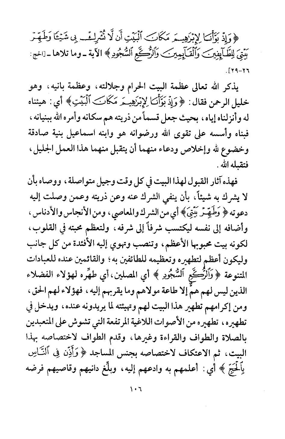 {وَإِذْ بَوَّأْنَا لِإِبْرَاهِيمَ مَكَانَ الْبَيْتِ أَنْ لَا تُشْرِكْ بِي شَيْئًا وَطَهِّرْ بَيْتِيَ لِلطَّائِفِينَ وَالْقَائِمِينَ وَالرُّكَّعِ السُّجُودِ} [الحج: 26] الآية - وما تلاها -[الحج: 26 - 29] .