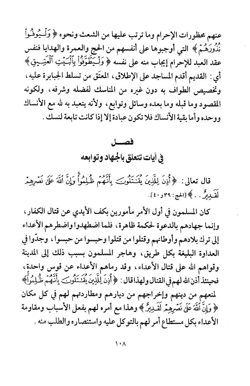 في آيات تتعلق بالجهاد وتوابعه قال تعالى: {أُذِنَ لِلَّذِينَ يُقَاتَلُونَ بِأَنَّهُمْ ظُلِمُوا وَإِنَّ اللَّهَ عَلَى نَصْرِهِمْ لَقَدِيرٌ} [الحج: 39]