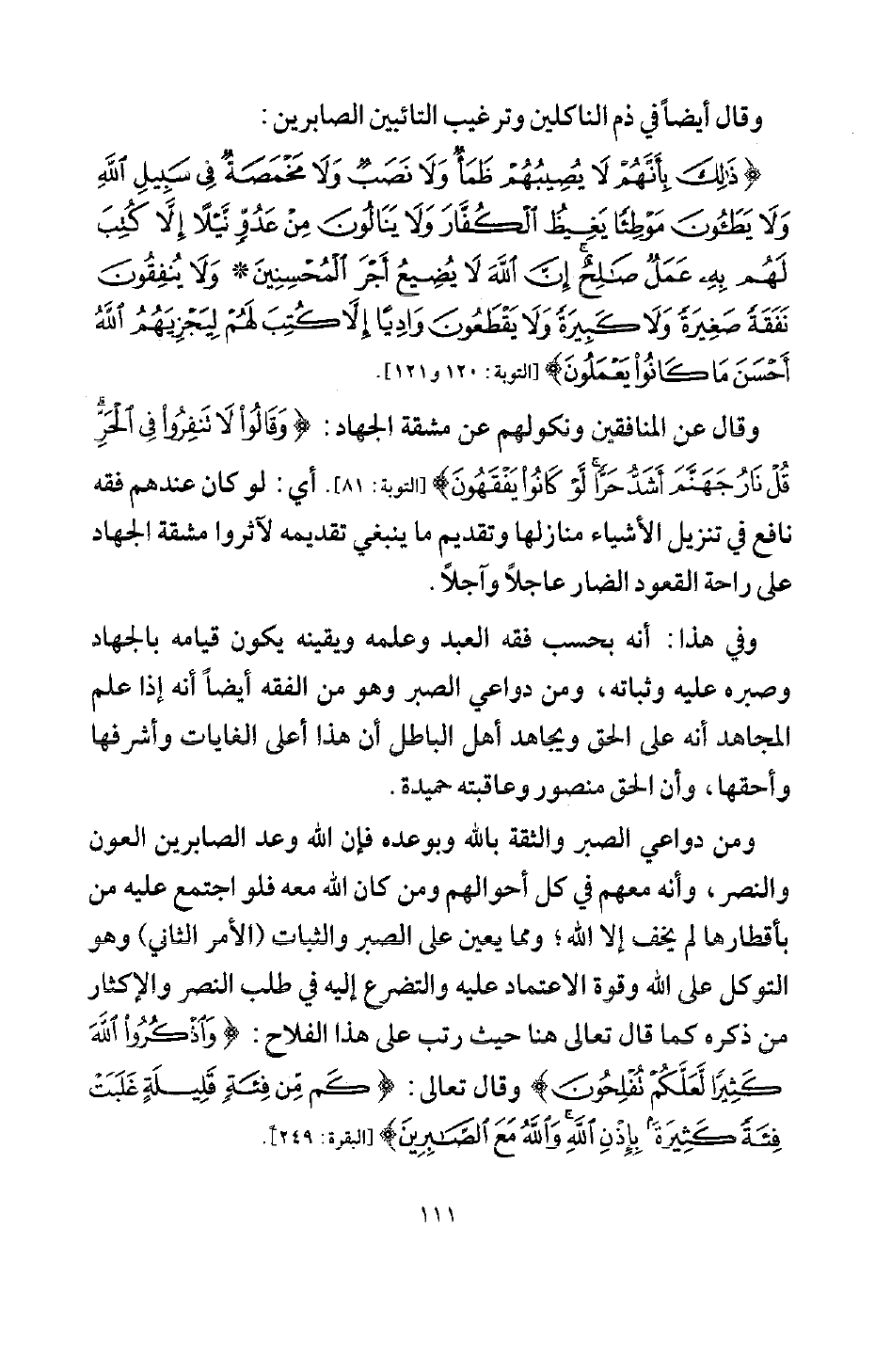وفي هذا أنه بحسب فقه العبد وعلمه ويقينه يكون قيامه بالجهاد، وصبره عليه وثباته، ومن دواعي الصبر وهو من الفقه أيضا أنه إذا علم المجاهد أنه على الحق ويجاهد أهل الباطل أن هذا أعلى الغايات وأشرفها وأحقها، وأن الحق منصور وعاقبته حميدة.