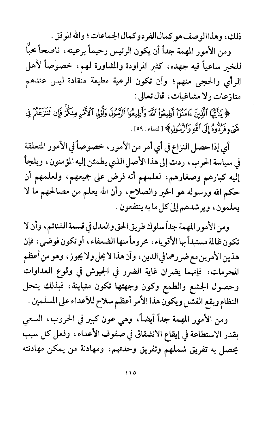 {يا أَيُّهَا الَّذِينَ آمَنُوا أَطِيعُوا اللَّهَ وَأَطِيعُوا الرَّسُولَ وَأُولِي الْأَمْرِ مِنْكُمْ فَإِنْ تَنَازَعْتُمْ فِي شَيْءٍ فَرُدُّوهُ إِلَى اللَّهِ وَالرَّسُولِ} [النساء: 59] أي: إذا حصل النزاع في أي أمر من الأمور، خصوصا في الأمور المتعلقة في سياسة الحرب، ردت إلى هذا الأصل الذي يطمئن إليه المؤمنون، ويلجأ إليه كبارهم وصغارهم، لعلمهم أنه فرض على جميعهم، ولعلمهم أن حكم الله ورسوله هو الخير والصلاح، وأن الله يعلم من مصالحهم ما لا يعلمون، ويرشدهم إلى كل ما به ينتفعون.
