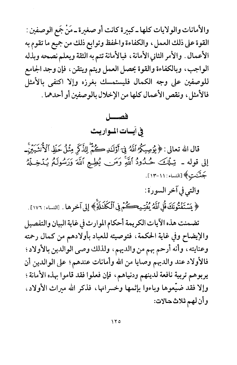 فصل في آيات المواريث قال الله تعالى: {يُوصِيكُمُ اللَّهُ فِي أَوْلَادِكُمْ لِلذَّكَرِ مِثْلُ حَظِّ الْأُنْثَيَيْنِ} [النساء: 11] إلى قوله: {تِلْكَ حُدُودُ اللَّهِ وَمَنْ يُطِعِ اللَّهَ وَرَسُولَهُ يُدْخِلْهُ جَنَّاتٍ} [النساء: 13]