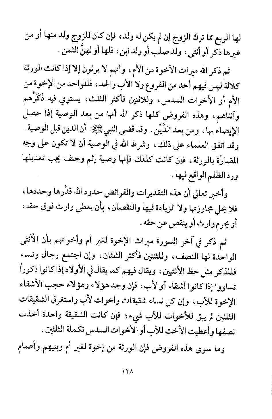ثم ذكر في آخر السورة ميراث الإخوة لغير أم وأخواتهم بأن الأنثى الواحدة لها النصف، وللثنتين فأكثر الثلثان، وإن اجتمع رجال ونساء فللذكر مثل حظ الأنثيين، ويقال فيهم كما يقال في الأولاد إذا كانوا ذكورا تساووا إذا كانوا أشقاء أو لأب، فإن وجد هؤلاء وهؤلاء حجب الأشقاء الإخوة للأب، وإن كن نساء شقيقات وأخوات لأب، واستغرق الشقيقات الثلثين لم يبق للأخوات للأب شيء؛ فإن كانت الشقيقة واحدة أخذت نصفها، وأعطيت الأخت للأب أو الأخوات السدس تكملة الثلثين.