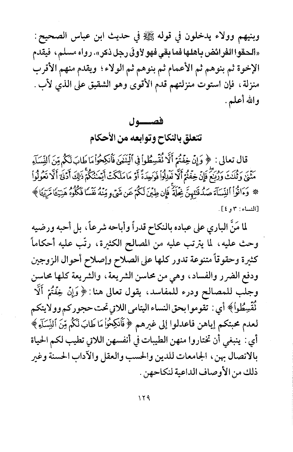 فصول تتعلق بالنكاح وتوابعه من الأحكام قال الله تعالى: {وَإِنْ خِفْتُمْ أَلَّا تُقْسِطُوا فِي الْيَتَامَى فَانْكِحُوا مَا طَابَ لَكُمْ مِنَ النِّسَاءِ مَثْنَى وَثُلَاثَ وَرُبَاعَ فَإِنْ خِفْتُمْ أَلَّا تَعْدِلُوا فَوَاحِدَةً أَوْ مَا مَلَكَتْ أَيْمَانُكُمْ ذَلِكَ أَدْنَى أَلَّا تَعُولُوا - وَآتُوا النِّسَاءَ صَدُقَاتِهِنَّ نِحْلَةً فَإِنْ طِبْنَ لَكُمْ عَنْ شَيْءٍ مِنْهُ نَفْسًا فَكُلُوهُ هَنِيئًا مَرِيئًا} [النساء: 3 - 4]