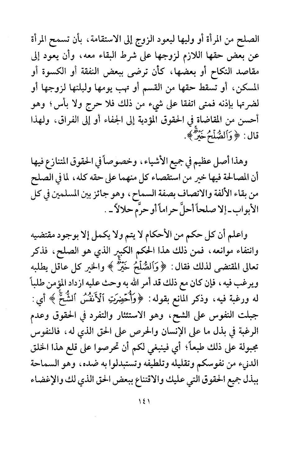وهذا أصل عظيم في جميع الأشياء، وخصوصا في الحقوق المتنازع فيها أن المصالحة فيها خير من استقصاء كل منهما على حقه كله؛ لما في الصلح من بقاء الألفة، والاتصاف بصفة السماح، وهو جائز بين المسلمين في كل الأبواب - إلا صلحا أحل حراما أو حرم حلالا -.