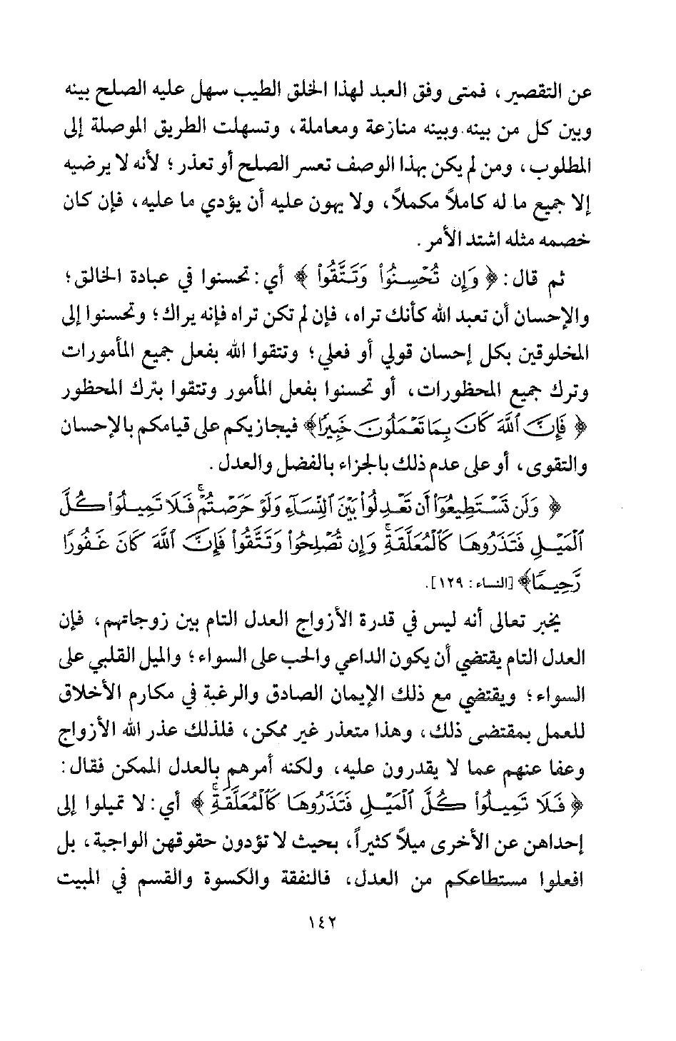 {وَلَنْ تَسْتَطِيعُوا أَنْ تَعْدِلُوا بَيْنَ النِّسَاءِ وَلَوْ حَرَصْتُمْ فَلَا تَمِيلُوا كُلَّ الْمَيْلِ فَتَذَرُوهَا كَالْمُعَلَّقَةِ وَإِنْ تُصْلِحُوا وَتَتَّقُوا فَإِنَّ اللَّهَ كَانَ غَفُورًا رَحِيمًا} [النساء: 129]