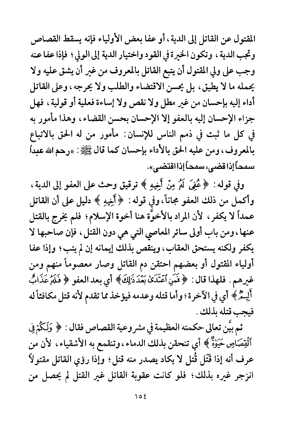 المقتول عن القاتل إلى الدية، أو عفا بعض الأولياء فإنه يسقط القصاص وتجب الدية، وتكون الخيرة في القود واختيار الدية إلى الولي، فإذا عفا عنه وجب على ولي المقتول أن يتبع القاتل بالمعروف من غير أن يشق عليه ولا يحمله ما لا يطيق، بل يحسن الاقتضاء والطلب ولا يحرجه، وعلى القاتل أداء إليه بإحسان من غير مطل ولا نقص ولا إساءة فعلية أو قولية، فهل جزاء الإحسان إليه بالعفو إلا الإحسان بحسن القضاء؟ وهذا مأمور به في كل ما ثبت في ذمم الناس للإنسان: مأمور من له الحق بالاتباع بالمعروف، ومن عليه الحق بالأداء بإحسان كما قال صلى الله عليه وسلم: «رحم الله عبدا سمحا إذا قضى، سمحا إذا اقتضى» .