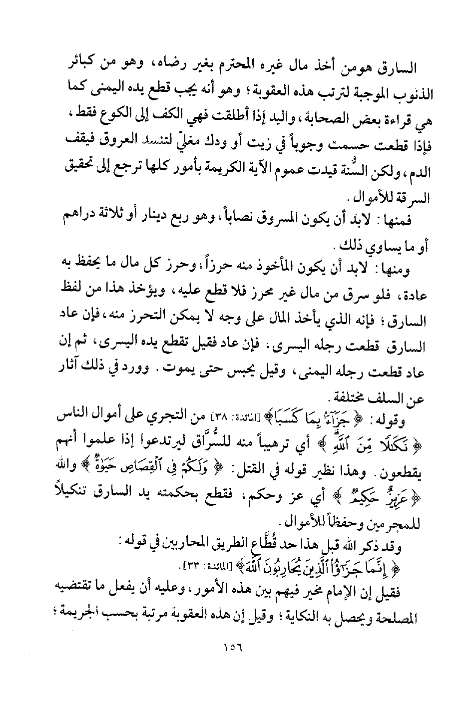 السارق هو من أخذ مال غيره المحترم بغير رضاه، وهو من كبائر الذنوب الموجبة لترتب هذه العقوبة، وهو أنه يجب قطع يده اليمنى كما هي قراءة بعض الصحابة، واليد إذا أطلقت فهي الكف إلى الكوع فقط، فإذا قطعت حسمت وجوبا في زيت أو ودك مغلي لتنسد العروق فيقف الدم، ولكن السنة قيدت عموم الآية الكريمة بأمور كلها ترجع إلى تحقيق السرقة للأموال.
