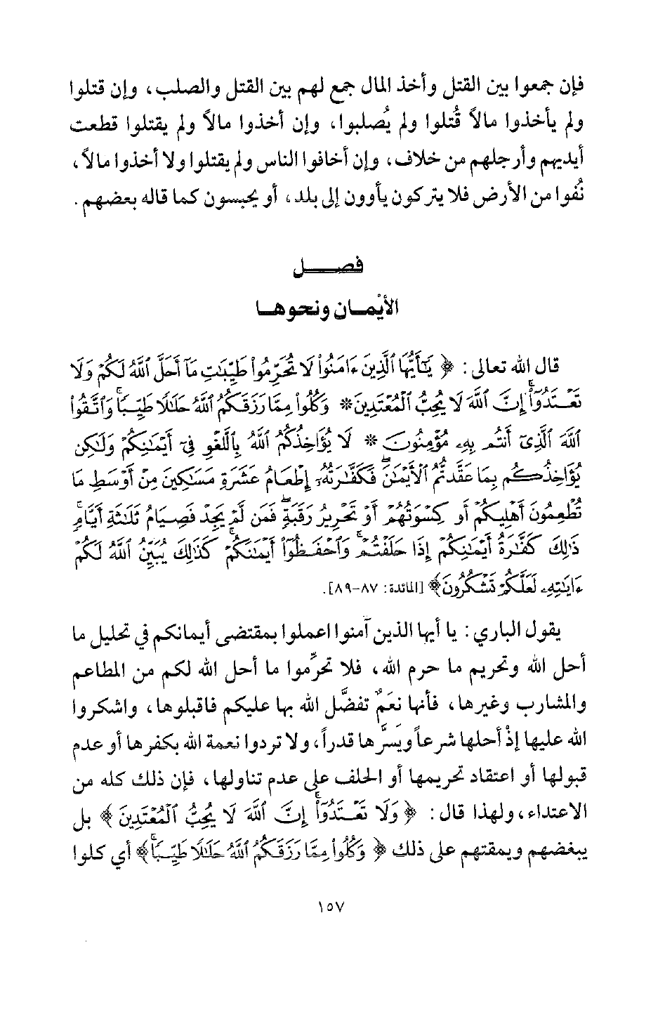 فصل في الأيمان ونحوها قال الله تعالى: {يا أَيُّهَا الَّذِينَ آمَنُوا لَا تُحَرِّمُوا طَيِّبَاتِ مَا أَحَلَّ اللَّهُ لَكُمْ وَلَا تَعْتَدُوا إِنَّ اللَّهَ لَا يُحِبُّ الْمُعْتَدِينَ - وَكُلُوا مِمَّا رَزَقَكُمُ اللَّهُ حَلَالًا طَيِّبًا وَاتَّقُوا اللَّهَ الَّذِي أَنْتُمْ بِهِ مُؤْمِنُونَ - لَا يُؤَاخِذُكُمُ اللَّهُ بِاللَّغْوِ فِي أَيْمَانِكُمْ وَلَكِنْ يُؤَاخِذُكُمْ بِمَا عَقَّدْتُمُ الْأَيْمَانَ فَكَفَّارَتُهُ إِطْعَامُ عَشَرَةِ مَسَاكِينَ مِنْ أَوْسَطِ مَا تُطْعِمُونَ أَهْلِيكُمْ أَوْ كِسْوَتُهُمْ أَوْ تَحْرِيرُ رَقَبَةٍ فَمَنْ لَمْ يَجِدْ فَصِيَامُ ثَلَاثَةِ أَيَّامٍ ذَلِكَ كَفَّارَةُ أَيْمَانِكُمْ إِذَا حَلَفْتُمْ وَاحْفَظُوا أَيْمَانَكُمْ كَذَلِكَ يُبَيِّنُ اللَّهُ لَكُمْ آيَاتِهِ لَعَلَّكُمْ تَشْكُرُونَ} [المائدة: 87 - 89]