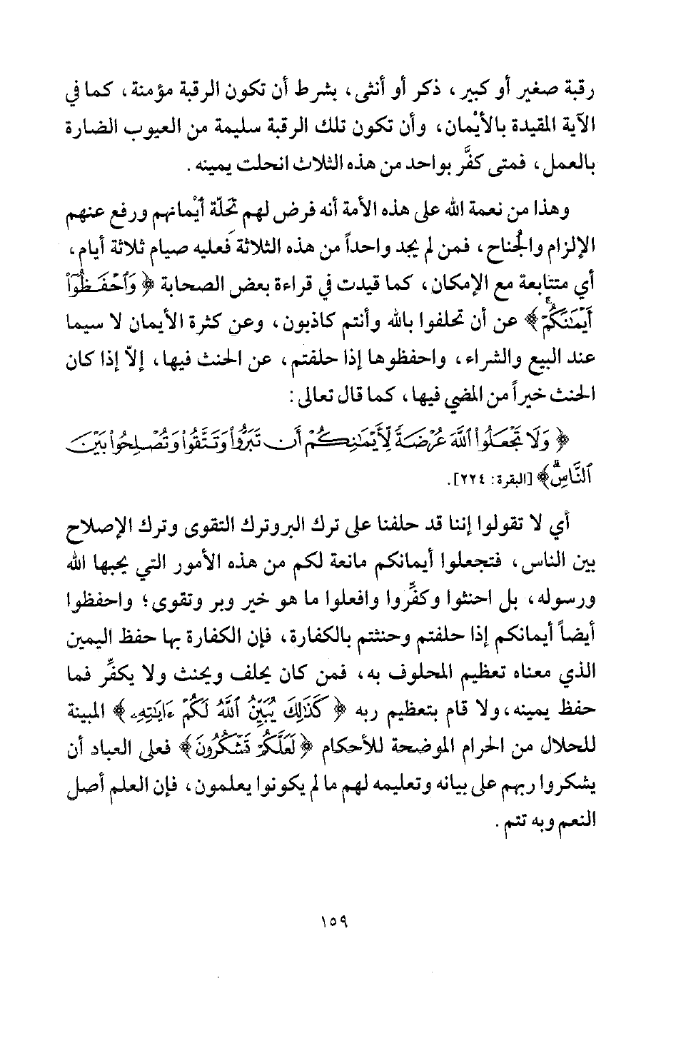 أي: لا تقولوا: إننا قد حلفنا على ترك البر، وترك التقوى، وترك الإصلاح بين الناس، فتجعلوا أيمانكم مانعة لكم من هذه الأمور التي يحبها الله ورسوله، بل احنثوا وكفروا وافعلوا ما هو خير وبر وتقوى، واحفظوا أيضا أيمانكم إذا حلفتم وحنثتم بالكفارة، فإن الكفارة بها حفظ اليمين الذي معناه تعظيم المحلوف به، فمن كان يحلف ويحنث ولا يكفر فما حفظ يمينه، ولا قام بتعظيم ربه {كَذَلِكَ يُبَيِّنُ اللَّهُ لَكُمْ آيَاتِهِ} [المائدة: 89] المبينة للحلال من الحرام، الموضحة للأحكام {لَعَلَّكُمْ تَشْكُرُونَ} [المائدة: 89] فعلى العباد أن يشكروا ربهم على بيانه وتعليمه لهم ما لم يكونوا يعلمون، فإن العلم أصل النعم وبه تتم.