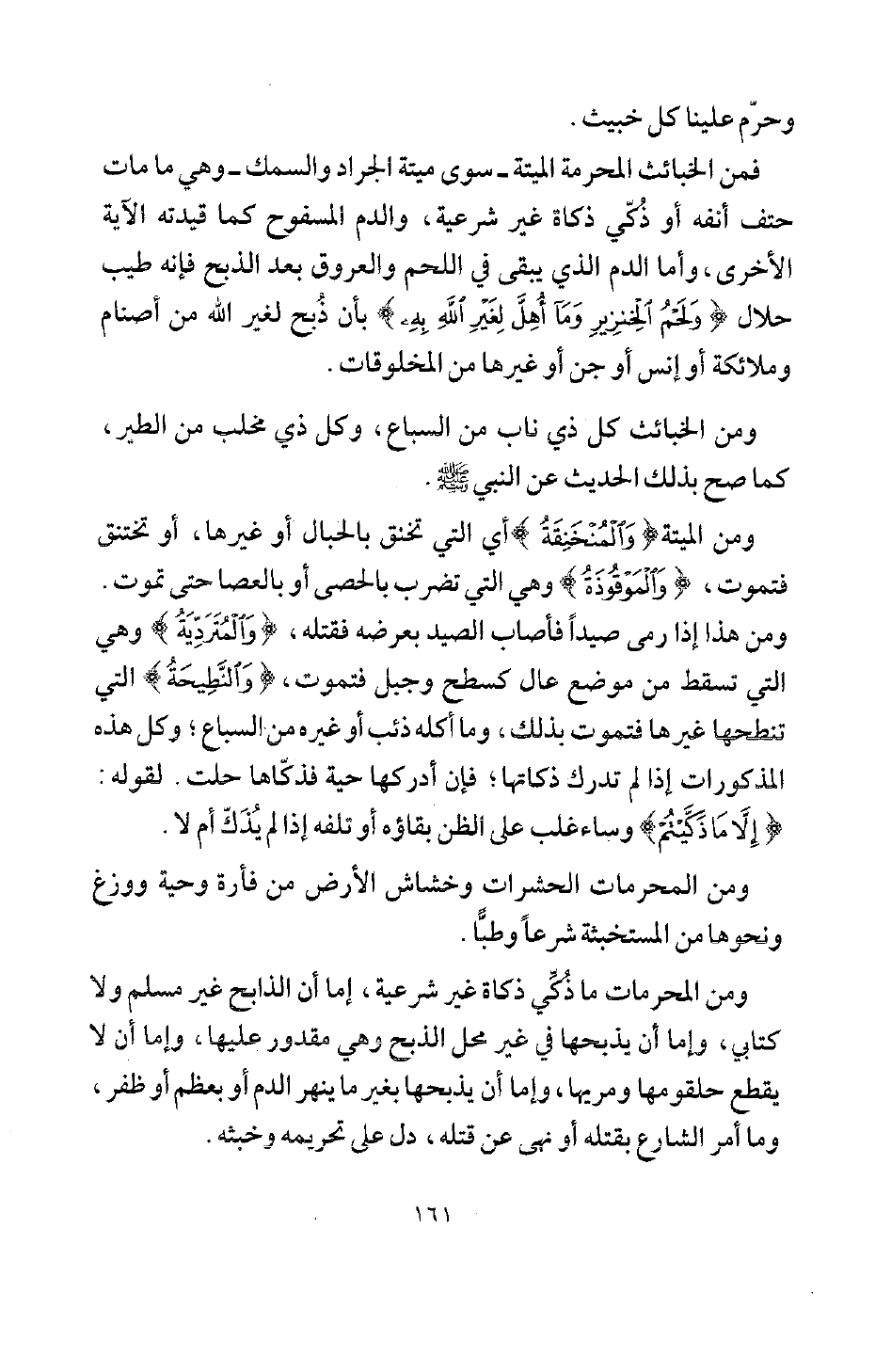 ومن المحرمات ما ذكي ذكاة غير شرعية، إما أن الذابح غير مسلم ولا كتابي، وإما أن يذبحها في غير محل الذبح وهي مقدور عليها، وإما أن لا يقطع حلقومها ومريها، وإما أن يذبحها بغير ما ينهر الدم أو بعظم أو ظفر، وما أمر الشارع بقتله أو نهى عن قتله دل على تحريمه وخبثه.