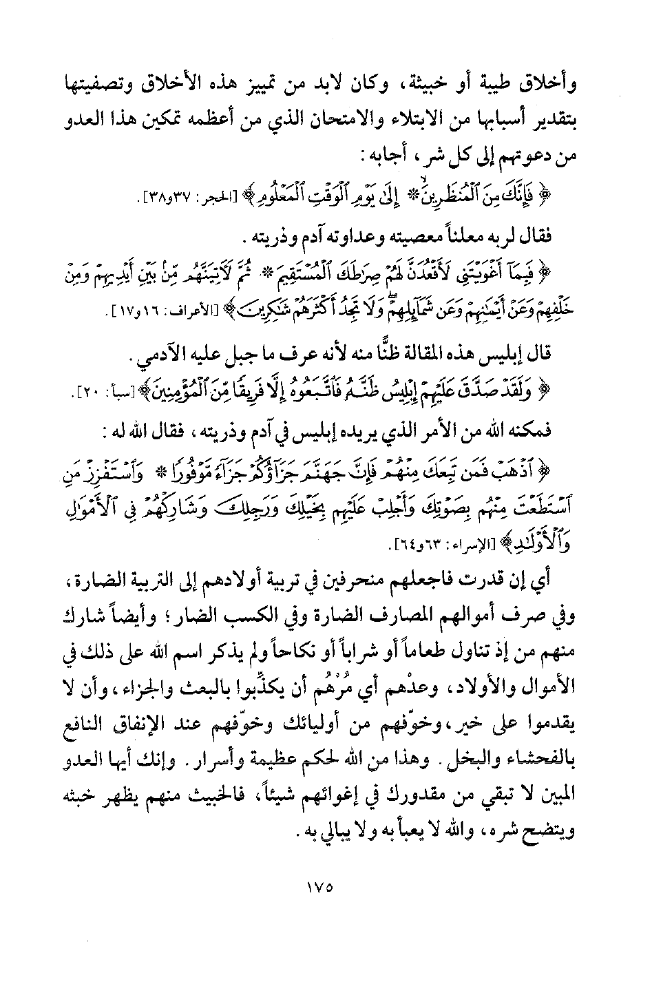 وأخلاق طيبة أو خبيثة، وكان لا بد من تمييز هذه الأخلاق وتصفيتها بتقدير أسبابها من الابتلاء والامتحان الذي من أعظمه تمكين هذا العدو من دعوتهم إلى كل شر، أجابه: