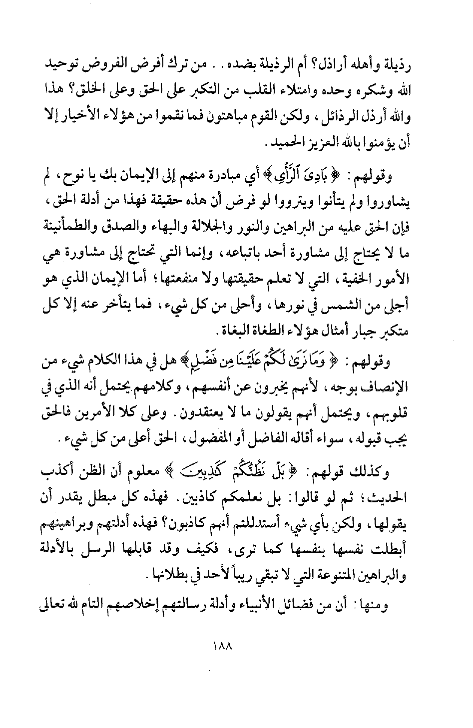 وقولهم: {بَادِيَ الرَّأْيِ} [هود: 27] أي: مبادرة منهم إلى الإيمان بك يا نوح، لم يشاوروا ولم يتأنوا ويترووا لو فرض أن هذا حقيقة فهذا من أدلة الحق، فإن الحق عليه من البراهين والنور والجلالة والبهاء والصدق والطمأنينة ما لا يحتاج إلى مشاورة أحد باتباعه، وإنما التي تحتاج إلى مشاورة هي الأمور الخفية، التي لا تعلم حقيقتها ولا منفعتها، أما الإيمان الذي هو أجلى من الشمس في نورها، وأحلى من كل شيء، فما يتأخر عنه إلا كل متكبر جبار أمثال هؤلاء الطغاة البغاة.