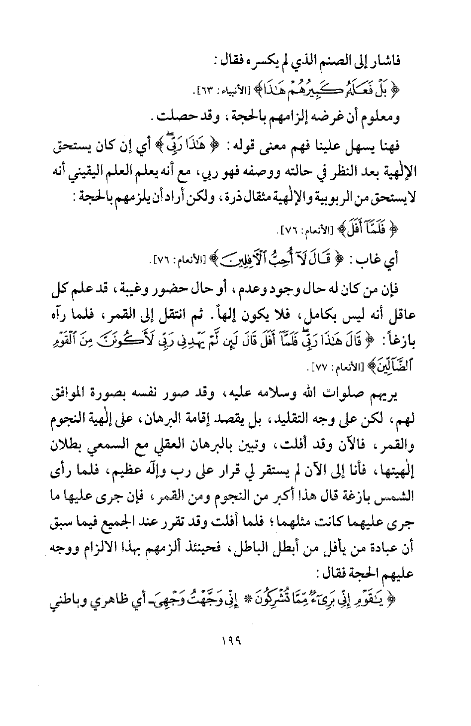 فإن من كان له حال وجود وعدم، أو حال حضور وغيبة، قد علم كل عاقل أنه ليس بكامل، فلا يكون إلها، ثم انتقل إلى القمر، فلما رآه بازغا: {قَالَ هَذَا رَبِّي فَلَمَّا أَفَلَ قَالَ لَئِنْ لَمْ يَهْدِنِي رَبِّي لَأَكُونَنَّ مِنَ الْقَوْمِ الضَّالِّينَ} [الأنعام: 77]