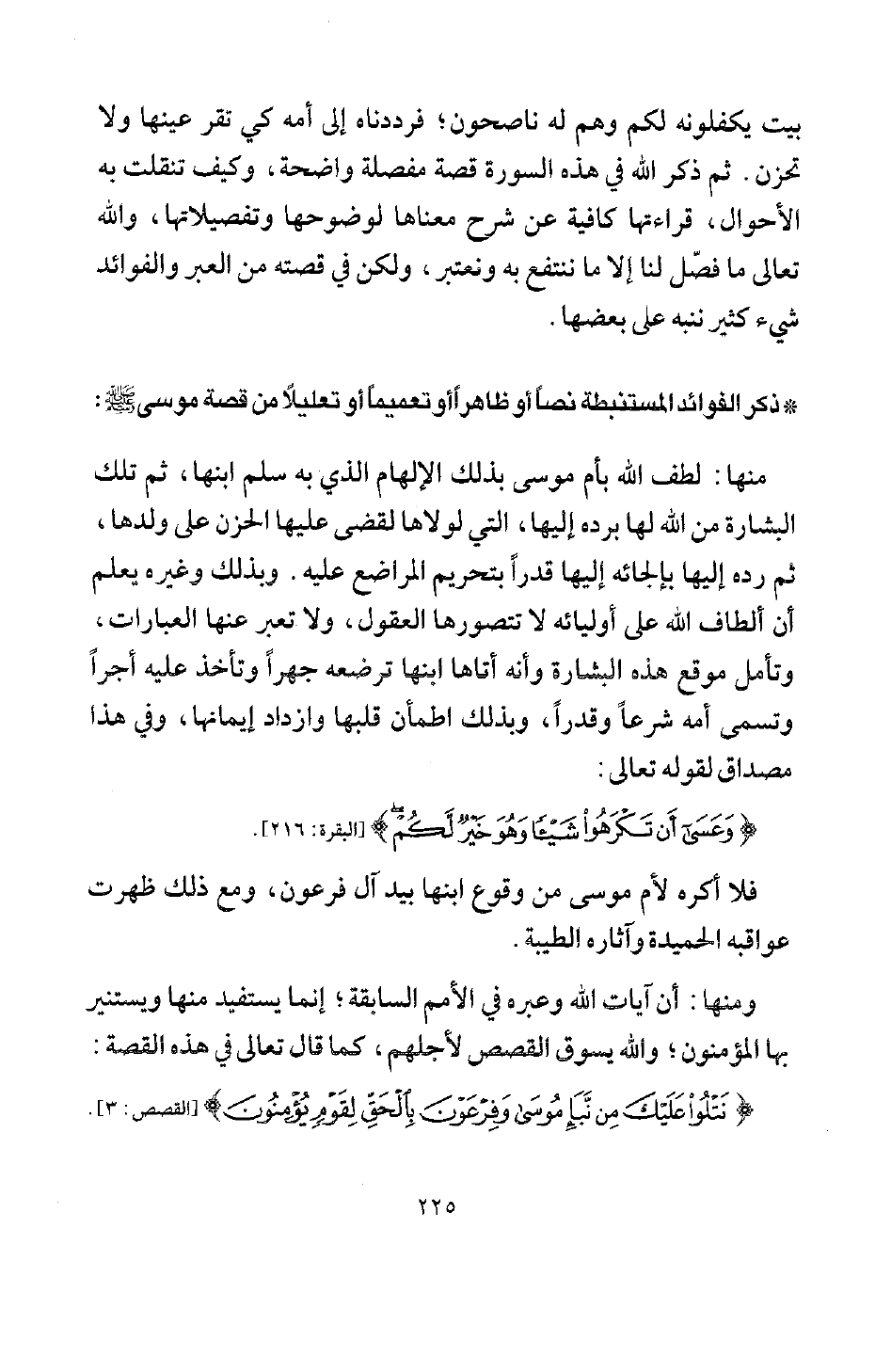 * ذكر الفوائد المستنبطة نصا أو ظاهرا أو تعميما أو تعليلا من قصة موسى صلى الله عليه وسلم: منها: لطف الله بأم موسى بذلك الإلهام الذي به سلم ابنها، ثم تلك البشارة من الله لها برده إليها، التي لولاها لقضى عليها الحزن على ولدها، ثم رده إليها بإلجائه إليها قدرا بتحريم المراضع عليه، وبذلك وغيره يعلم أن ألطاف الله على أوليائه لا تتصورها العقول، ولا تعبر عنها العبارات، وتأمل موقع هذه البشارة، وأنه أتاها ابنها ترضعه جهرا، وتأخذ عليه أجرا، وتسمى أمه شرعا وقدرا، وبذلك اطمأن قلبها، وازداد إيمانها، وفي هذا مصداق لقوله تعالى: