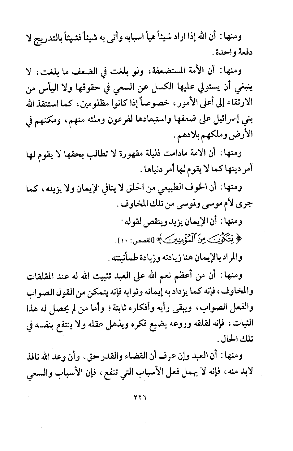 ومنها: أن الله إذا أراد شيئا هيأ أسبابه، وأتى به شيئا فشيئا بالتدريج لا دفعة واحدة.