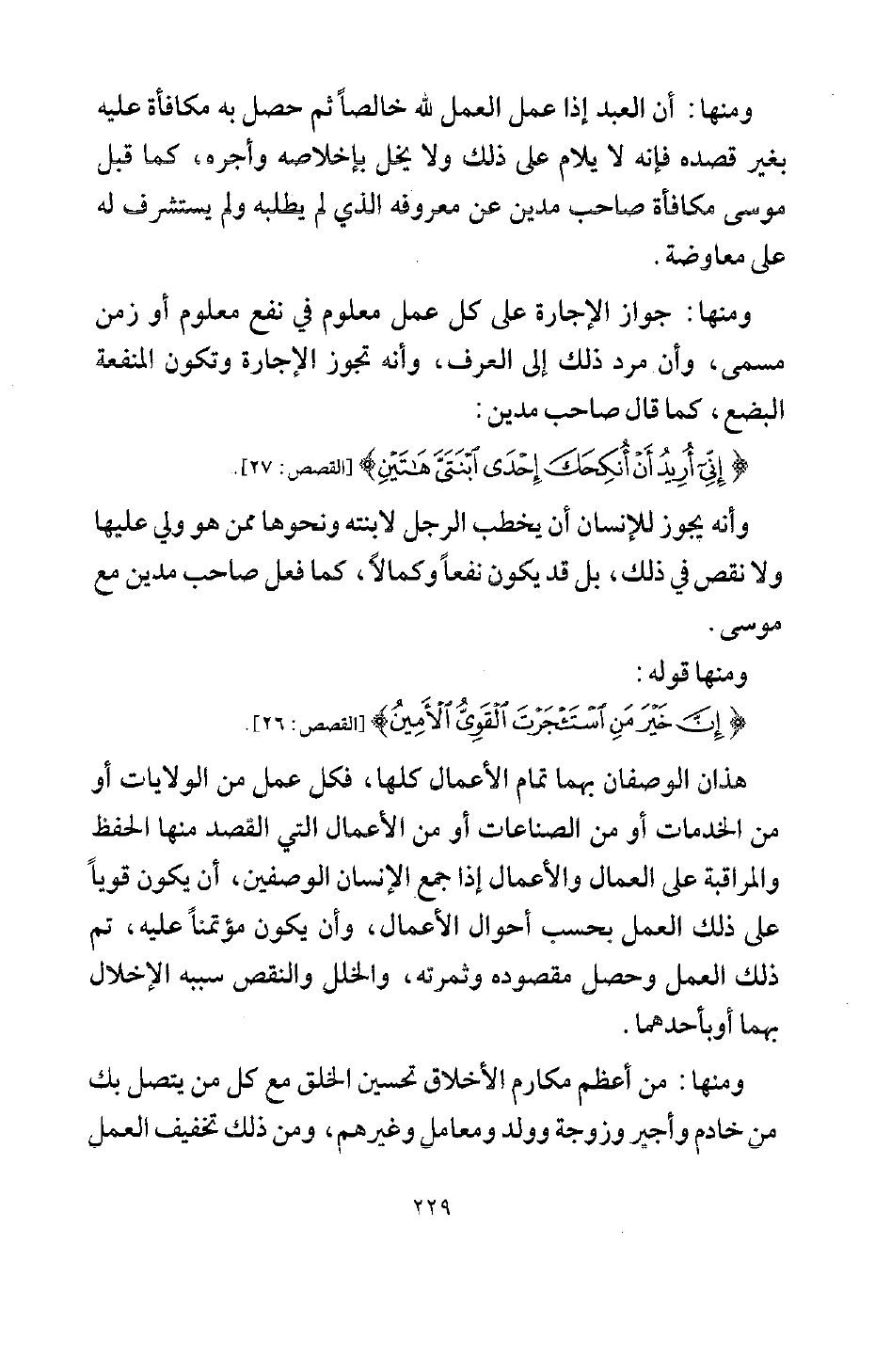 ومنها: أن العبد إذا عمل العمل لله خالصا، ثم حصل به مكافأة عليه بغير قصده فإنه لا يلام على ذلك، ولا يخل بإخلاصه وأجره، كما قبل موسى مكافأة صاحب مدين عن معروفه الذي لم يطلبه، ولم يستشرف له على معاوضة.