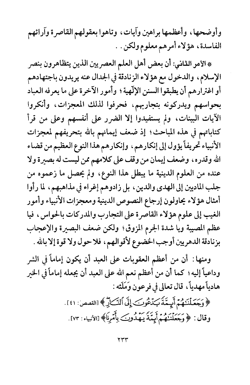 * الأمر الثاني: أن بعض أهل العلم العصريين الذين يتظاهرون بنصر الإسلام، والدخول مع هؤلاء الزنادقة في الجدال عنه يريدون باجتهادهم أو اغترارهم أن يطبقوا السنن الإلهية وأمور الآخرة على ما يعرفه العباد بحواسهم، ويدركونه بتجاربهم، فحرفوا لذلك المعجزات، وأنكروا الآيات البينات، ولم يستفيدوا إلا الضرر على أنفسهم، وعلى من قرأ كتاباتهم في هذه المباحث؛ إذ ضعف إيمانهم بالله بتحريفهم لمعجزات الأنبياء تحريفا يؤول إلى إنكارها، وإنكارهم هذا النوع العظيم من قضاء الله وقدره، وضعف إيمان من وقف على كلامهم ممن ليست له بصيرة، ولا عنده من العلوم الدينية ما يبطل هذا النوع، ولم يحصل ما زعموه من جلب الماديين إلى الهدى والدين، بل زادوهم إغراء في مذاهبهم، لما رأوا أمثال هؤلاء يحاولون إرجاع النصوص الدينية، ومعجزات الأنبياء، وأمور الغيب إلى علوم هؤلاء القاصرة على التجارب المدركات بالحواس، فيا عظم المصيبة، ويا شدة الجرم المزوق، ولكن ضعف البصيرة والإعجاب بزنادقة الدهريين أوجب الخضوع لأقوالهم، فلا حول ولا قوة إلا بالله.