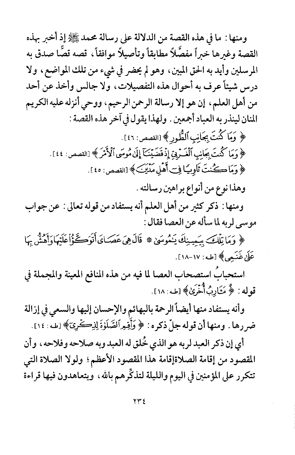 وأنه يستفاد منها أيضا الرحمة بالبهائم، والإحسان إليها، والسعي في إزالة ضررها، ومنها: أن قوله جلَّ ذكره: {وَأَقِمِ الصَّلَاةَ لِذِكْرِي} [طه: 14] أي أن ذكر العبد لربه هو الذي خُلق له العبد، وبه صلاحه وفلاحه، وأن المقصود من إقامة الصلاة إقامة هذا المقصود الأعظم، ولولا الصلاة التي تتكرر على المؤمنين في اليوم والليلة لتذكِّرهم بالله، ويتعاهدون فيها قراءة