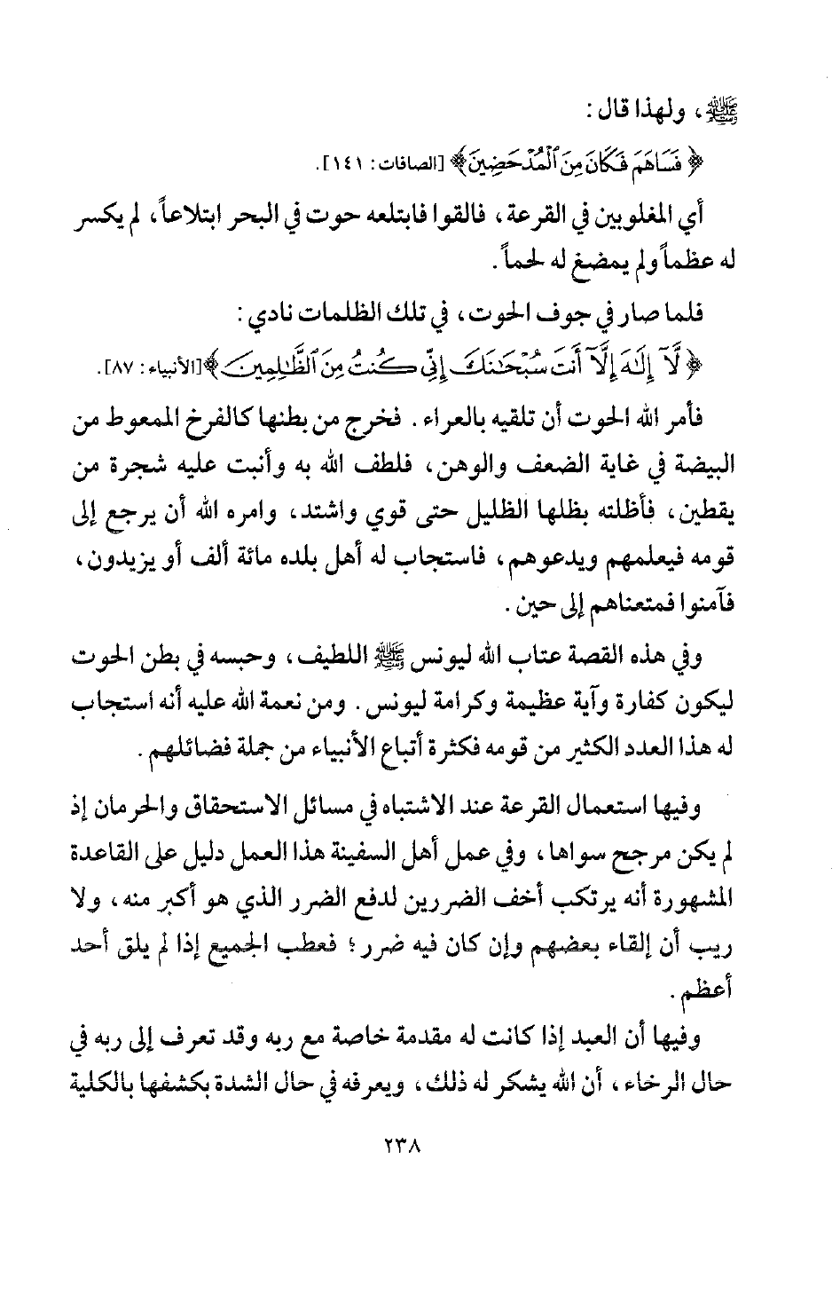 وفيها استعمال القرعة عند الاشتباه في مسائل الاستحقاق والحرمان إذا لم يكن مرجح سواها، وفي عمل أهل السفينة هذا العمل دليل على القاعدة المشهورة أنه يرتكب أخف الضررين لدفع الضرر الذي هو أكبر منه، ولا ريب أن إلقاء بعضهم وإن كان فيه ضرر، فعطب الجميع إذا لم يلق أحد أعظم.
