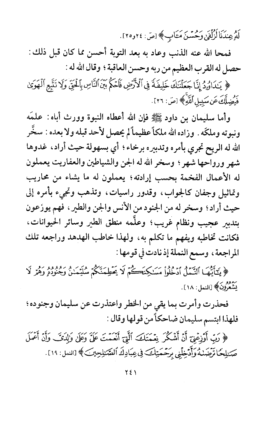 وأما سليمان بن داود صلى الله عليه وسلم فإن الله أعطاه النبوة وورث أباه: علمَه ونبوته وملكَه، وزاده الله ملكا عظيما لم يحصل لأحد قبله ولا بعده: سخَّر الله له الريح تجري بأمره وتدبيره برخاء، أي: بسهولة حيث أراد، غدوها شهر ورواحها شهر، وسخر الله له الجن والشياطين والعفاريت يعملون له الأعمال الفخمة بحسب إرادته، يعملون له ما يشاء من محاريب وتماثيل وجفان كالجواب، وقدور راسيات، وتذهب وتجيء بأمره إلى حيث أراد، وسخر له من الجنود من الإنس والجن والطير، فهم يوزعون بتدبير عجيب ونظام غريب، وعلَّمه منطق الطير وسائر الحيوانات، فكانت تخاطبه ويفهم ما تكلم به، ولهذا خاطب الهدهد وراجعه تلك المراجعة، وسمع النملة إذ نادت في قومها: