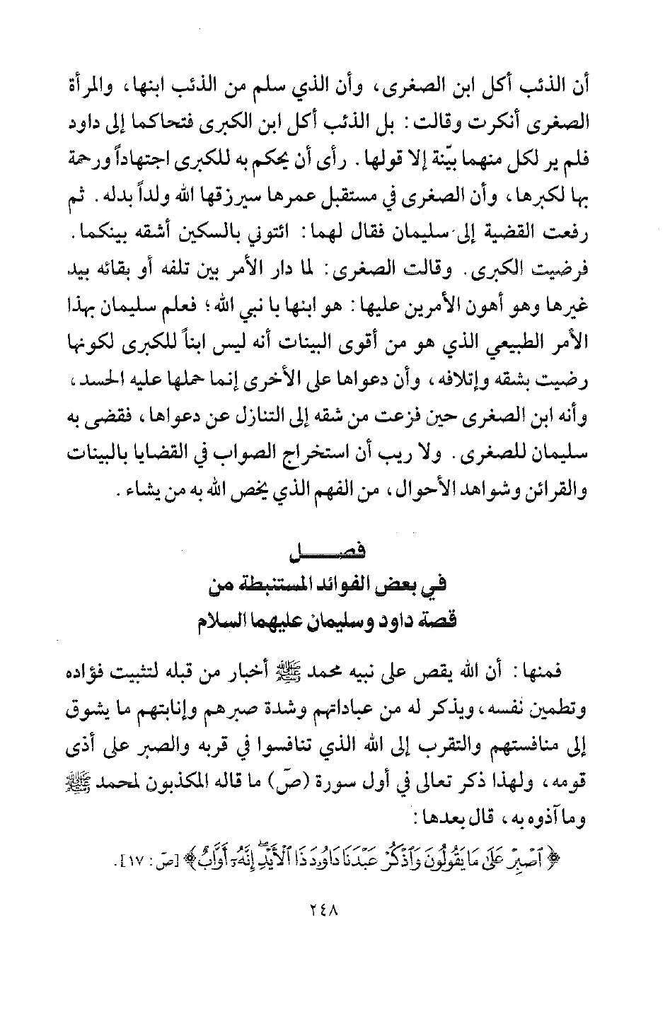 في بعض الفوائد المستنبطة من قصة داود وسليمان عليهما السلام فمنها: أن الله يقص على نبيه محمد صلى الله عليه وسلم أخبار من قبله لتثبيت فؤاده وتطمين نفسه، ويذكر له من عباداتهم، وشدة صبرهم وإنابتهم ما يشوق إلى منافستهم، والتقرب إلى الله الذي تنافسوا في قربه والصبر على أذى قومه، ولهذا ذكر تعالى في أول سورة (ص) ما قاله المكذبون لمحمد صلى الله عليه وسلم وما آذوه به، قال بعدها: