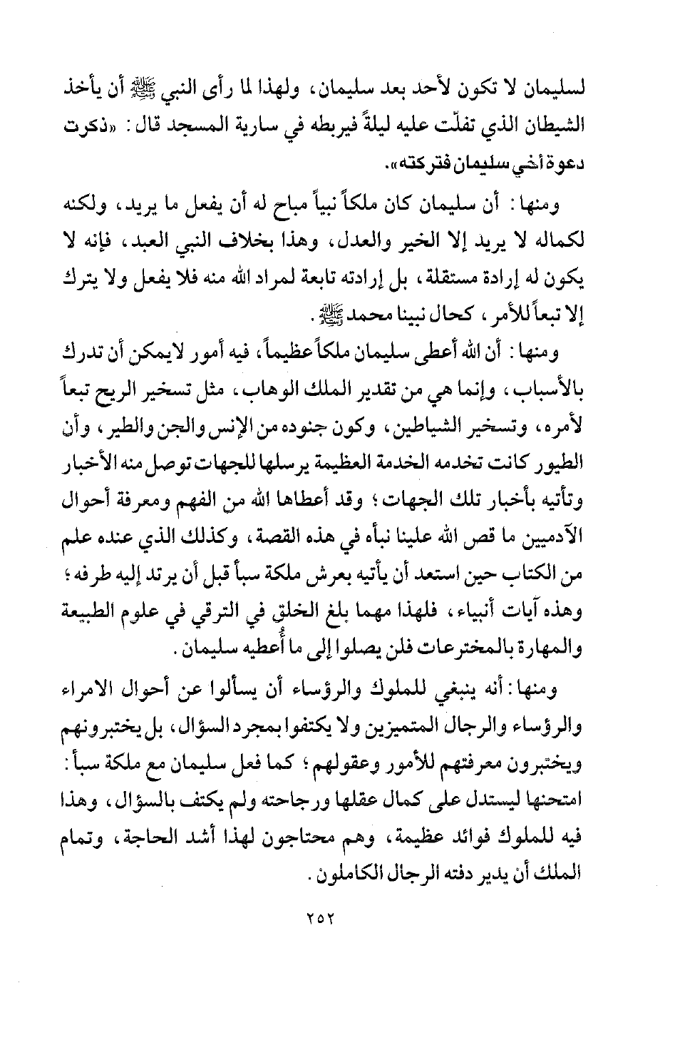 ومنها: أنه ينبغي للملوك والرؤساء أن يسألوا عن أحوال الأمراء والرؤساء والرجال المتميزين، ولا يكتفوا بمجرد السؤال، بل يختبرونهم ويختبرون معرفتهم للأمور وعقولهم، كما فعل سليمان مع ملكة سبأ: امتحنها ليستدل على كمال عقلها ورجاحته، ولم يكتف بالسؤال، وهذا فيه للملوك فوائد عظيمة، وهم محتاجون لهذا أشد الحاجة، وتمام الملك أن يدير دفته الرجال الكاملون.