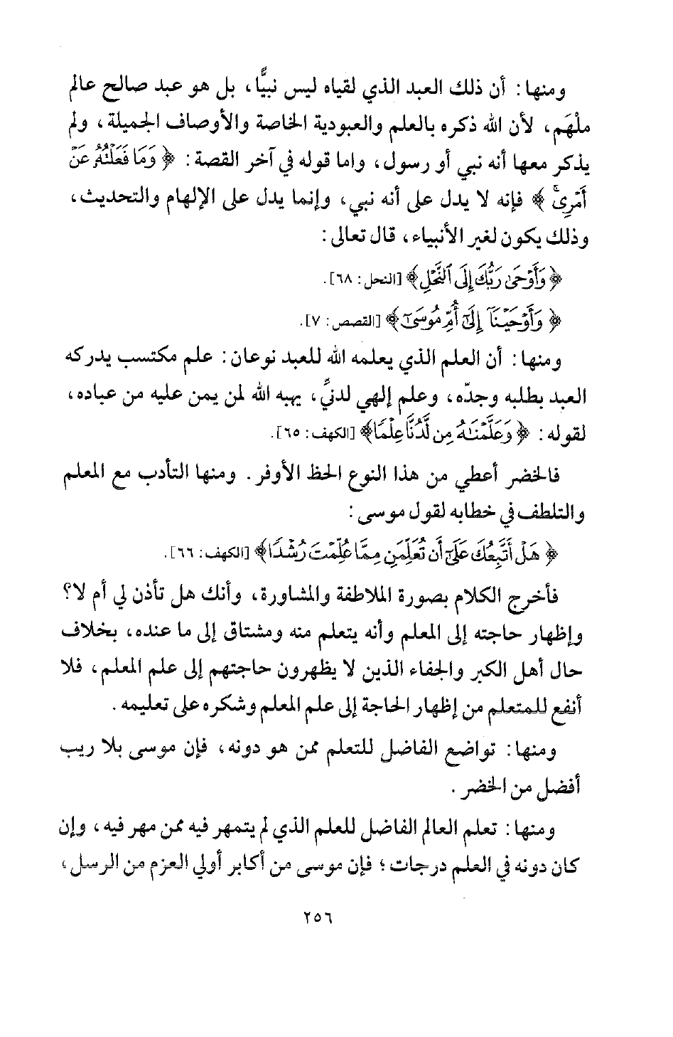 ومنها: أن العلم الذي يعلمه الله للعبد نوعان: علم مكتسب، يدركه العبد بطلبه وجدّه، وعلم إلهي لدنِّي، يهبه الله لمن يمن عليه من عباده، لقوله: {وَعَلَّمْنَاهُ مِنْ لَدُنَّا عِلْمًا} [الكهف: 65]