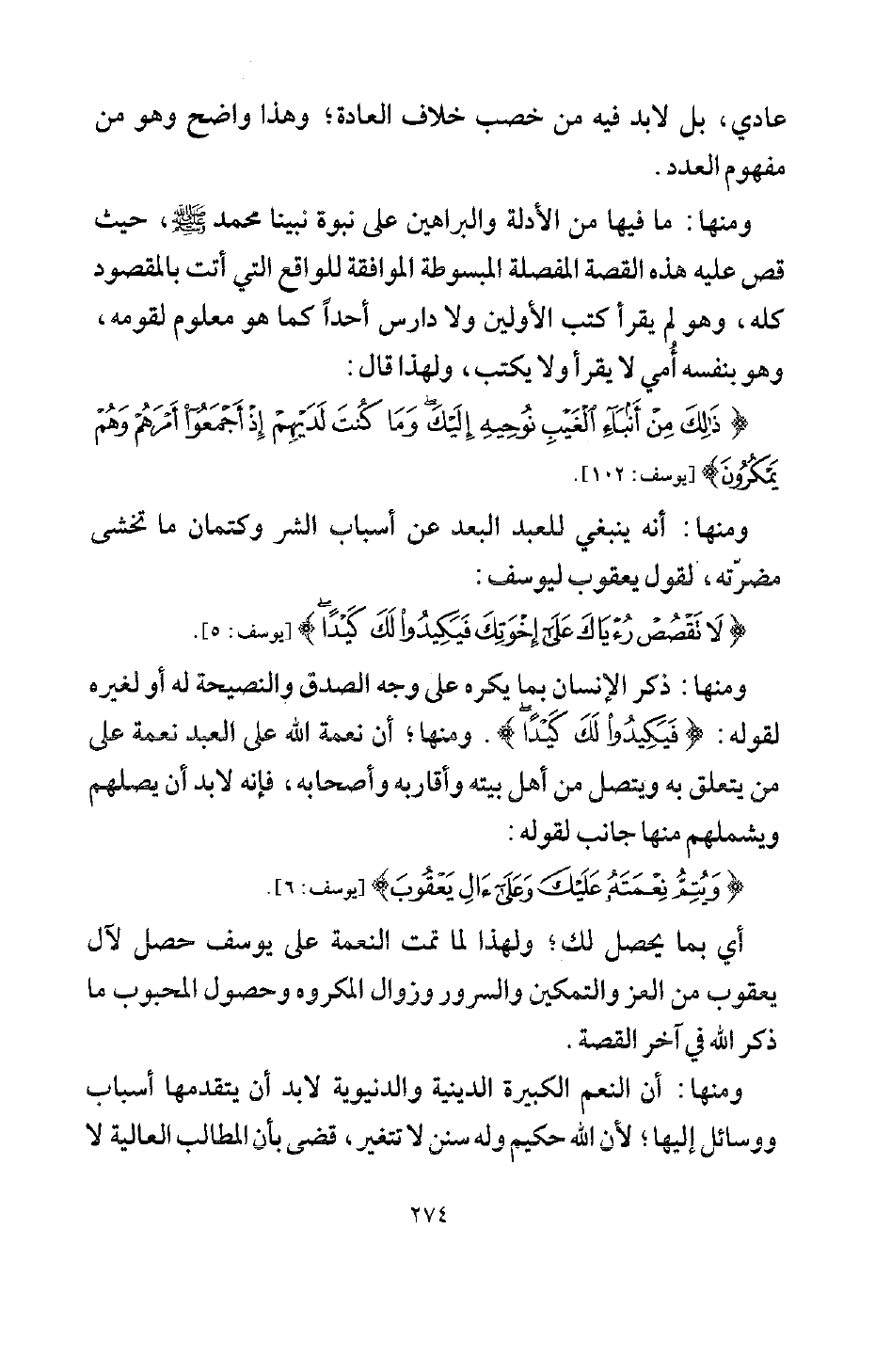 ومنها: ذكر الإنسان بما يكره على وجه الصدق والنصيحة له أو لغيره لقوله: {فَيَكِيدُوا لَكَ كَيْدًا} [يوسف: 5] ومنها: أن نعمة الله على العبد نعمة على من يتعلق به، ويتصل من أهل بيته وأقاربه وأصحابه، فإنه لا بد أن يصلهم ويشملهم منها جانب لقوله: