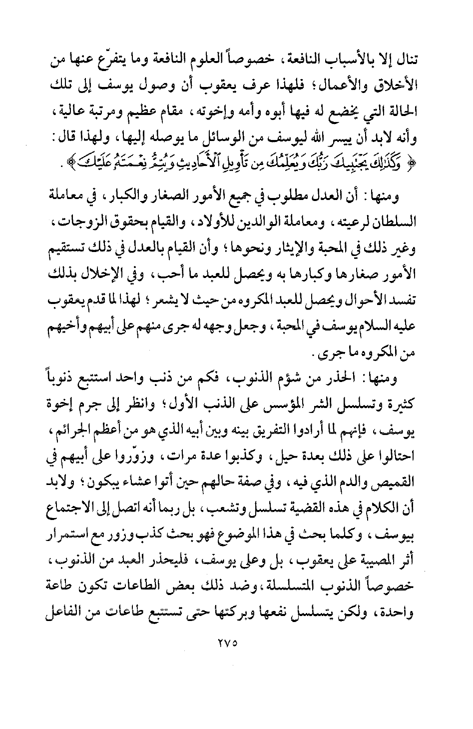 ومنها: أن العدل مطلوب في جميع الأمور الصغار والكبار في معاملة السلطان لرعيته، ومعاملة الوالدين للأولاد، والقيام بحقوق الزوجات، وغير ذلك في المحبة والإيثار ونحوها، وأن القيام بالعدل في ذلك تستقيم الأمور صغارها وكبارها به، ويحصل للعبد ما أحب، وفي الإخلال بذلك تفسد الأحوال، ويحصل للعبد المكروه من حيث لا يشعر؛ لهذا لما قدم يعقوب يوسف في المحبة، وجعل وجهه له جرى منهم على أبيهم وأخيهم من المكروه ما جرى.