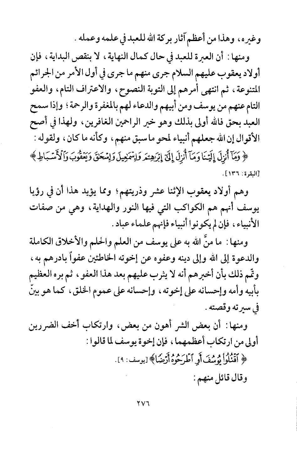 ومنها: أن العبرة للعبد في حال كمال النهاية، لا بنقص البداية، فإن أولاد يعقوب عليهم السلام جرى منهم ما جرى في أول الأمر من الجرائم المتنوعة، ثم انتهى أمرهم إلى التوبة النصوح، والاعتراف التام، والعفو التام عنهم من يوسف ومن أبيهم، والدعاء لهم بالمغفرة والرحمة، وإذا سمح العبد بحق فالله أولى بذلك وهو خير الراحمين الغافرين، ولهذا في أصح الأقوال إن الله جعلهم أنبياء لمحو ما سبق منهم، وكأنه ما كان، ولقوله: