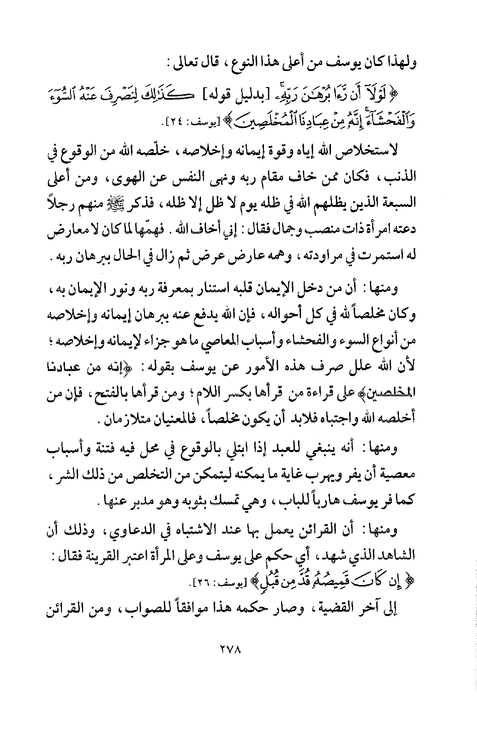 ومنها: أن من دخل الإيمان قلبه استنار بمعرفة ربه ونور الإيمان به، وكان مخلصا لله في كل أحواله، فإن الله يدفع عنه ببرهان إيمانه وإخلاصه من أنواع السوء والفحشاء وأسباب المعاصي ما هو جزاء لإيمانه وإخلاصه؛ لأن الله علل صرف هذه الأمور عن يوسف بقوله: {إِنَّهُ مِنْ عِبَادِنَا الْمُخْلَصِينَ} [يوسف: 24] على قراءة من قرأها بكسر اللام، ومن قرأها بالفتح فإن من أخلصه الله واجتباه فلا بد أن يكون مخلصا، فالمعنيان متلازمان.