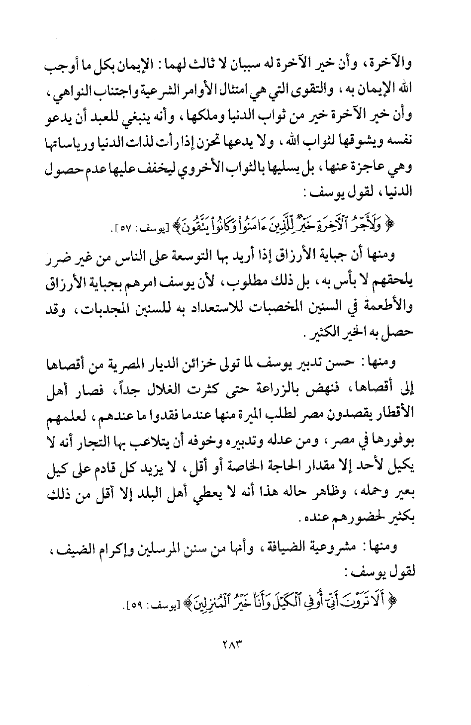 ومنها: حسن تدبير يوسف لما تولى خزائن الديار المصرية من أقصاها إلى أقصاها، فنهض بالزراعة حتى كثرت الغلال جدا، فصار أهل الأقطار يقصدون مصر لطلب الميرة منها عندما فقدوا ما عندهم؛ لعلمهم بوفورها في مصر، ومن عدله وتدبيره وخوفه أن يتلاعب بها التجار أنه لا يكيل لأحد إلا مقدار الحاجة الخاصة أو أقل، لا يزيد كل قادم على كيل بعير وحمله، وظاهر حاله هذا أنه لا يعطي أهل البلد إلا أقل من ذلك بكثير لحضورهم عنده.