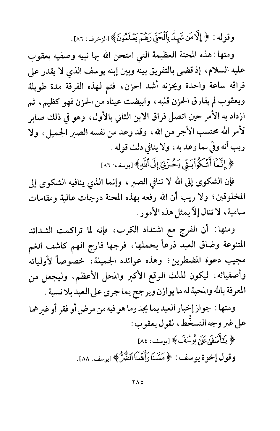 ومنها: هذه المحنة العظيمة التي امتحن الله بها نبيه وصفيه يعقوب عليه السلام، إذ قضى بالتفريق بينه وبين ابنه يوسف الذي لا يقدر على فراقه ساعة واحدة، ويحزنه أشد الحزن، فتم لهذه الفرقة مدة طويلة ويعقوب لم يفارق الحزن قلبه، وابيضت عيناه من الحزن فهو كظيم، ثم ازداد به الأمر حين اتصل فراق الابن الثاني بالأول، وهو في ذلك صابر لأمر الله، محتسب الأجر من الله، وقد وعد من نفسه الصبر الجميل، ولا ريب أنه وفّى بما وعد به، ولا ينافي ذلك قوله: