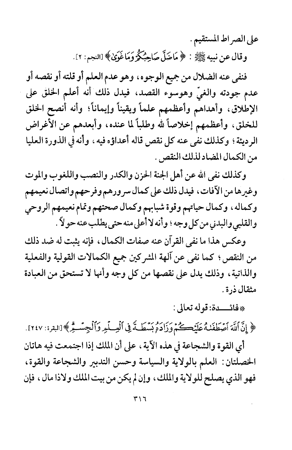 فنفى عنه الضلال من جميع الوجوه، وهو عدم العلم أو قلته أو نقصه أو عدم جودته والغيّ وهو سوء القصد، فيدل ذلك أنه أعلم الخلق على الإطلاق، وأهداهم وأعظمهم علما ويقينا وإيمانا، وأنه أنصح الخلق للخلق، وأعظمهم إخلاصا لله وطلبا لما عنده، وأبعدهم عن الأغراض الرديئة، وكذلك نفى عنه كل نقص قاله أعداؤه فيه، وأنه في الذروة العليا من الكمال المضاد لذلك النقص.