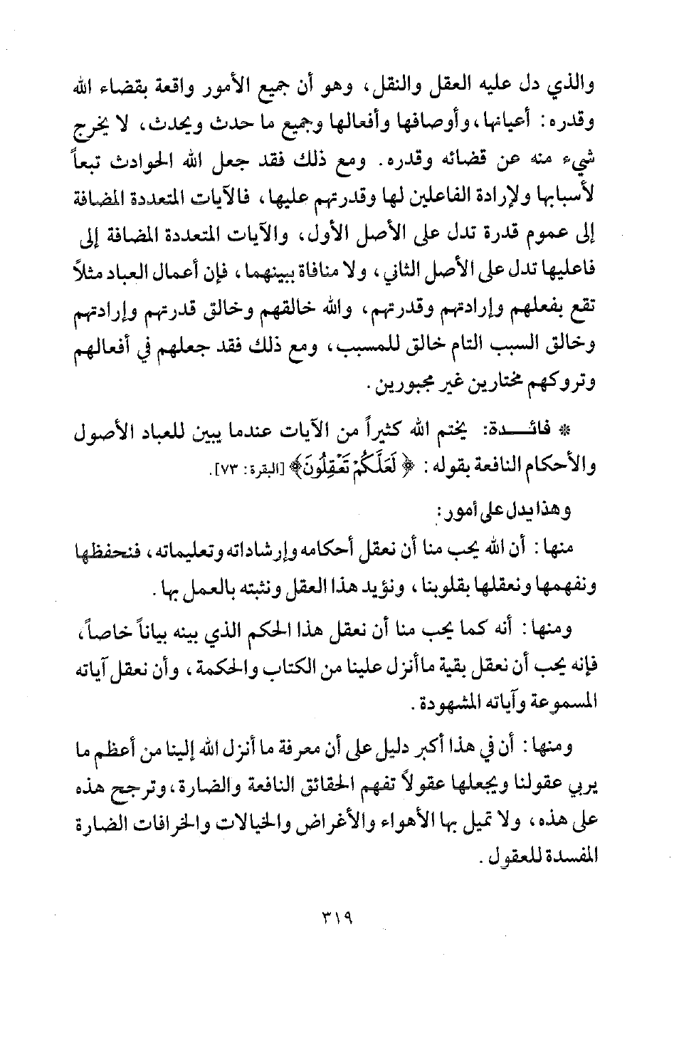 والذي دل عليه العقل والنقل، وهو أن جميع الأمور واقعة بقضاء الله وقدره: أعيانها وأوصافها وأفعالها، وجميع ما حدث ويحدث، لا يخرج شيء منه عن قضائه وقدره، ومع ذلك فقد جعل الله الحوادث تبعا لأسبابها، ولإرادة الفاعلين لها وقدرتهم عليها، فالآيات المتعددة المضافة إلى عموم قدرة تدل على الأصل الأول، والآيات المتعددة المضافة إلى فاعليها تدل على الأصل الثاني، ولا منافاة بينهما، فإن أعمال العباد مثلا تقع بفعلهم وإرادتهم وقدرتهم، والله خالقهم وخالق قدرتهم وإرادتهم وخالق السبب التام خالق للمسبب، ومع ذلك فقد جعلهم في أفعالهم وتروكهم مختارين غير مجبورين.