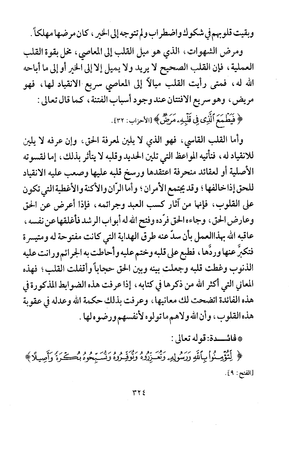 وأما القلب القاسي فهو الذي لا يلين لمعرفة الحق، وإن عرفه لا يلين للانقياد له، فتأتيه المواعظ التي تلين الحديد وقلبه لا يتأثر بذلك، إما لقسوته الأصلية أو لعقائد منحرفة اعتقدها ورسخ قلبه عليها، وصعب عليه الانقياد للحق إذا خالفها، وقد يجتمع الأمران، وأما الران والأكنة والأغطية التي تكون على القلوب فإنها من آثار كسب العبد وجرائمه، فإذا أعرض عن الحق وعارض الحق، وجاءه الحق فردَّه وفتح الله له أبواب الرشد فأغلقها عن نفسه عاقبه الله بهذا العمل بأن سدَّ عنه طرق الهداية التي كانت مفتوحة له ومتيسرة، فتكبر عنها وردَّها، فطبع على قلبه وختم عليه، وأحاطت به الجرائم ورانت عليه الذنوب وغطت قلبه، وجعلت بينه وبين الحق حجابا وأقفلت القلب، فهذه المعاني التي أكثر الله من ذكرها في كتابه، إذا عرفت هذه الضوابط المذكورة في هذه الفائدة اتضحت لك معانيها، وعرفت بذلك حكمة الله وعدله في عقوبة هذه القلوب، وأن الله ولاهم ما تولوه لأنفسهم ورضوه لها.