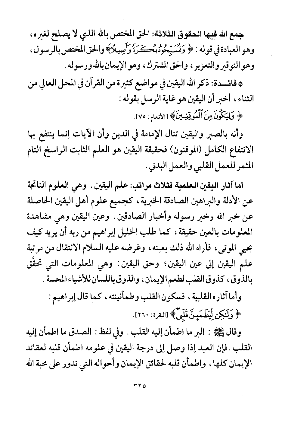أما آثار اليقين العلمية فثلاث مراتب: علم اليقين، وهي العلوم الناتجة عن الأدلة والبراهين الصادقة الخبرية، كجميع علوم أهل اليقين الحاصلة عن خبر الله وخبر رسوله وأخبار الصادقين، وعين اليقين وهي مشاهدة المعلومات بالعين حقيقة، كما طلب الخليل إبراهيم من ربه أن يريه كيف يحيي الموتى، فأراه الله ذلك بعينه، وغرضه عليه السلام الانتقال من مرتبة علم اليقين إلى عين اليقين، وحق اليقين: وهي المعلومات التي تحقَّق بالذوق، كذوق القلب لطعم الإيمان، والذوق باللسان للأشياء المحسة.