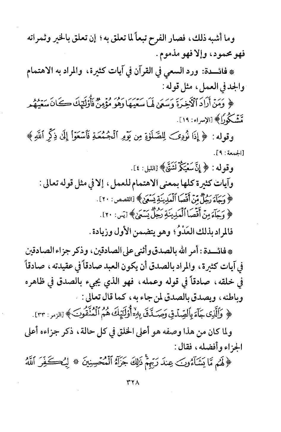 * فائدة: أمر الله بالصدق وأثنى على الصادقين، وذكر جزاء الصادقين في آيات كثيرة، والمراد بالصدق أن يكون العبد صادقا في عقيدته، صادقا في خلقه، صادقا في قوله وعمله، فهو الذي يجيء بالصدق في ظاهره وباطنه، ويصدق بالصدق لمن جاء به، كما قال تعالى: