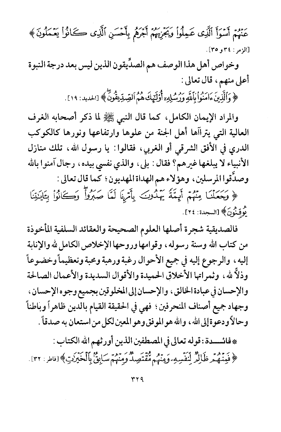 فالصديقية شجرة أصلها العلوم الصحيحة والعقائد السلفية المأخوذة من كتاب الله وسنة رسوله، وقوامها وروحها الإخلاص الكامل لله والإنابة إليه، والرجوع إليه في جميع الأحوال رغبة ورهبة ومحبة وتعظيما وخضوعا وذلا لله، وثمراتها الأخلاق الحميدة والأقوال السديدة والأعمال الصالحة، والإحسان في عبادة الخالق، والإحسان إلى المخلوقين بجميع وجوه الإحسان، وجهاد جميع أصناف المنحرفين، فهي في الحقيقة القيام بالدين ظاهرا وباطنا وحالا ودعوة إلى الله، والله هو الموفق وهو المعين لكل من استعان به صدقا.