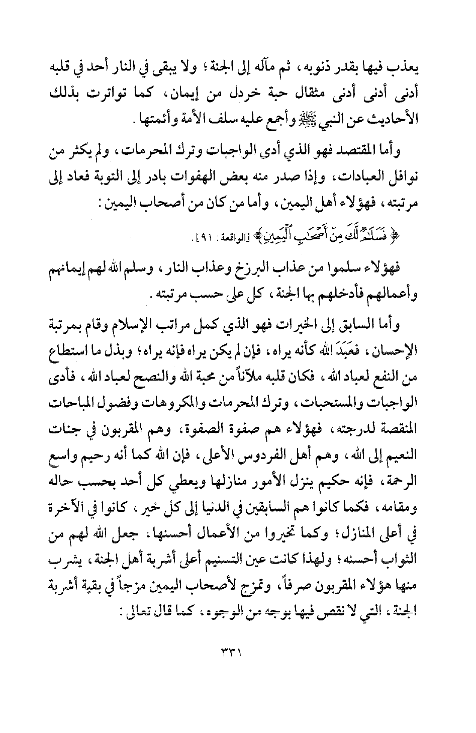 وأما المقتصد فهو الذي أدى الواجبات وترك المحرمات، ولم يكثر من نوافل العبادات، وإذا صدر منه بعض الهفوات بادر إلى التوبة فعاد إلى مرتبته، فهؤلاء أهل اليمين، وأما من كان من أصحاب اليمين: