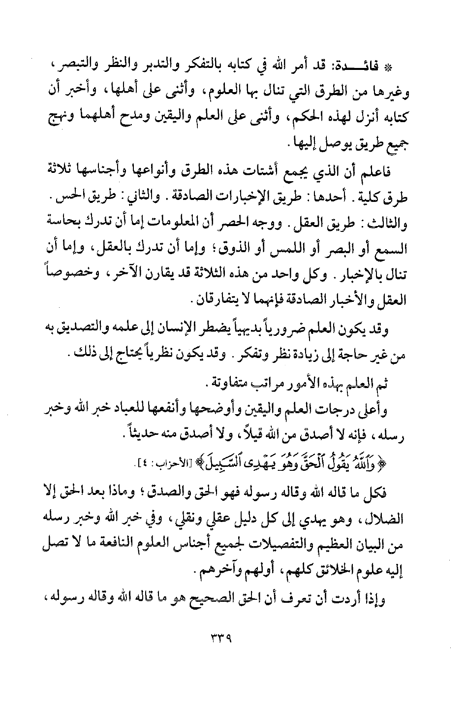 * فائدة: قد أمر الله في كتابه بالتفكر والتدبر والنظر والتبصر، وغيرها من الطرق التي تنال بها العلوم، وأثنى على أهلها، وأخبر أن كتابه أنزل لهذه الحكم، وأثنى على العلم واليقين ومدح أهلهما، ونهج جميع طريق يوصل إليها.