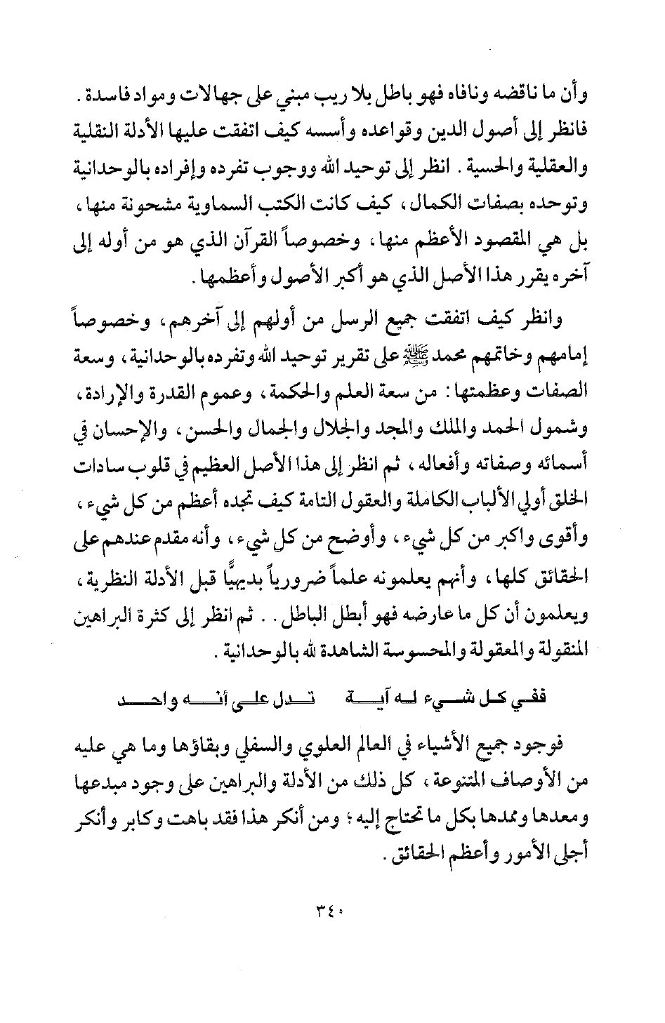 وانظر كيف اتفقت جميع الرسل من أولهم إلى آخرهم، وخصوصا إمامهم وخاتمهم محمد صلى الله عليه وسلم على تقرير توحيد الله وتفرده بالوحدانية، وسعة الصفات وعظمتها: من سعة العلم والحكمة، وعموم القدرة والإرادة، وشمول الحمد والملك والمجد والجلال والجمال والحسن، والإحسان في أسمائه وصفاته وأفعاله؟ ثم انظر إلى هذا الأصل العظيم في قلوب سادات الخلق أولي الألباب الكاملة والعقول التامة كيف تجده أعظم من كل شيء، وأقوى وأكبر من كل شيء، وأوضح من كل شيء، وأنه مقدم عندهم على الحقائق كلها، وأنهم يعلمونه علما ضروريا بديهيا قبل الأدلة النظرية، ويعلمون أن كل ما عارضه فهو أبطل الباطل؟ ثم انظر إلى كثرة البراهين المنقولة والمعقولة والمحسوسة الشاهدة لله بالوحدانية.