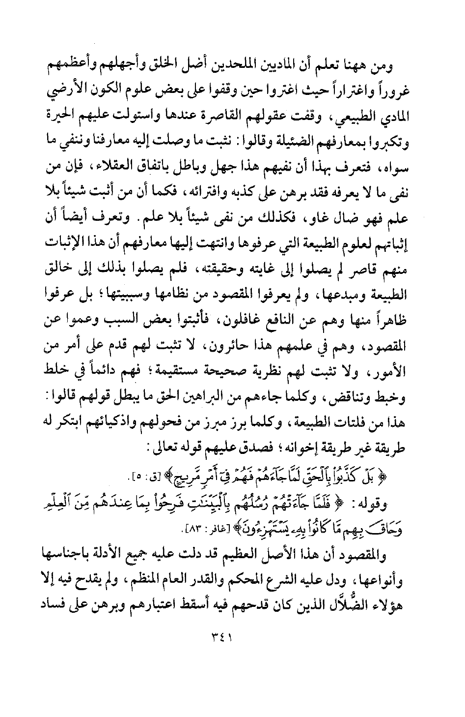 ومن هاهنا تعلم أن الماديين الملحدين أضل الخلق وأجهلهم وأعظمهم غرورا واغترارا حيث اغتروا حين وقفوا على بعض علوم الكون الأرضي المادي الطبيعي، وقفت عقولهم القاصرة عندها، واستولت عليهم الحيرة وتكبروا بمعارفهم الضئيلة وقالوا: نثبت ما وصلت إليه معارفنا وننفي ما سواه، فتعرف بهذا أن نفيهم هذا جهل وباطل باتفاق العقلاء، فإن من نفى ما لا يعرفه فقد برهن على كذبه وافترائه، فكما أن من أثبت شيئا بلا علم فهو ضال غاو، فكذلك من نفى شيئا بلا علم، وتعرف أيضا أن إثباتهم لعلوم الطبيعة التي عرفوها وانتهت إليها معارفهم أن هذا الإثبات منهم قاصر لم يصلوا إلى غايته وحقيقته، فلم يصلوا بذلك إلى خالق الطبيعة ومبدعها، ولم يعرفوا المقصود من نظامها وسببيتها؛ بل عرفوا ظاهرا منها وهم عن النافع غافلون، فأثبتوا بعض السبب وعموا عن المقصود، وهم في علمهم هذا حائرون، لا تثبت لهم قدم على أمر من الأمور، ولا تثبت لهم نظرية صحيحة مستقيمة، فهم دائما في خلط وخبط وتناقض، وكلما جاءهم من البراهين الحق ما يبطل قولهم قالوا: هذا من فلتات الطبيعة، وكلما برز مبرز من فحولهم وأذكيائهم ابتكر له طريقة غير طريقة إخوانه؛ فصدق عليهم قوله تعالى: