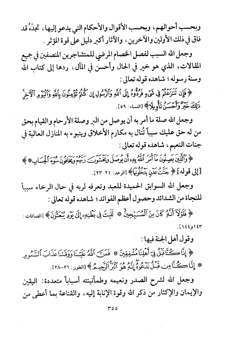 وجعل الله السبب لفصل الخصام المرضي للمتشاجرين المنصفين في جميع المقالات، الذي هو خير في الحال، وأحسن في المآل، ردها إلى كتاب الله وسنة رسوله، شاهده قوله تعالى: