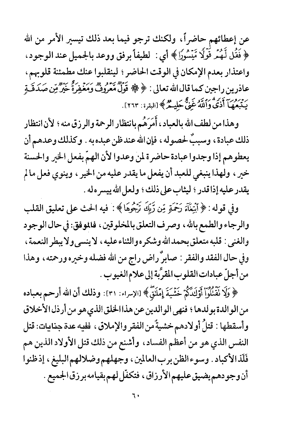 {وَلَا تَقْتُلُوا أَوْلَادَكُمْ خَشْيَةَ إِمْلَاقٍ} [الإسراء: 31] وذلك أن الله أرحم بعباده من الوالدة بولدها، فنهى الوالدين عن هذا الخلق الذي هو من أرذل الأخلاق وأسقطها: قتل أولادهم خشية من الفقر والإملاق، ففيه عدة جنايات: قتل النفس الذي هو من أعظم الفساد، وأشنع من ذلك قتل الأولاد الذين هم فلذ الأكباد، وسوء الظن برب العالمين، وجهلهم وضلالهم البليغ، إذ ظنوا أن وجودهم يضيق عليهم الأرزاق، فتكفل لهم بقيامه برزق الجميع.