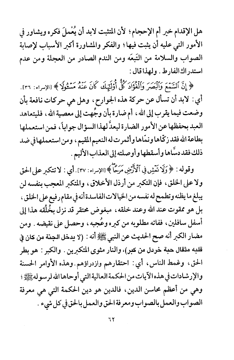 وقوله: {وَلَا تَمْشِ فِي الْأَرْضِ مَرَحًا} [الإسراء: 37] أي: لا تتكبر على الحق، ولا على الخلق، فإن التكبر من أرذل الأخلاق، والمتكبر المعجب بنفسه لن يبلغ ما يظنه وتطمح له نفسه من الخيالات الفاسدة أنه في مقام رفيع على الخلق، بل هو ممقوت عند الله وعند خلقه، مبغوض محتقر قد نزل بخلقه هذا إلى أسفل سافلين، ففاته مطلوبه من كبره وعجبه، وحصل على نقيضه، ومن مضار الكبر أنه صح الحديث عن النبي صلى الله عليه وسلم أنه: «لا يدخل الجنة من كان في قلبه مثقال حبة خردل من كبر» ، والنار مثوى المتكبرين، والكبر هو بطر الحق، وغمط الناس، أي: احتقارهم وازدراؤهم، وهذه الأوامر الحسنة والإرشادات في هذه الآيات من الحكمة العالية التي أوحاها الله لرسوله صلى الله عليه وسلم؛ وهي من أعظم محاسن الدين، فالدين هو دين الحكمة التي هي معرفة الصواب والعمل بالصواب، ومعرفة الحق والعمل بالحق في كل شيء.
